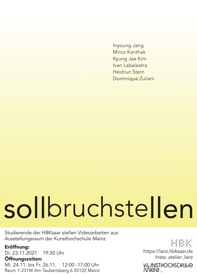»sollbruchstellen« zeigt Videoarbeiten von Saarbrücker Studierenden im Ausstellungsraum der Kunsthochschule Mainz. Die Arbeiten sind in verschiedenen kooperativen Kontexten an der HBKsaar entstanden und werden hier in einer abgestimmten Präsentation installiert. Sie bearbeiten auf diverse Art und Weise den Bezug zum Raum.
