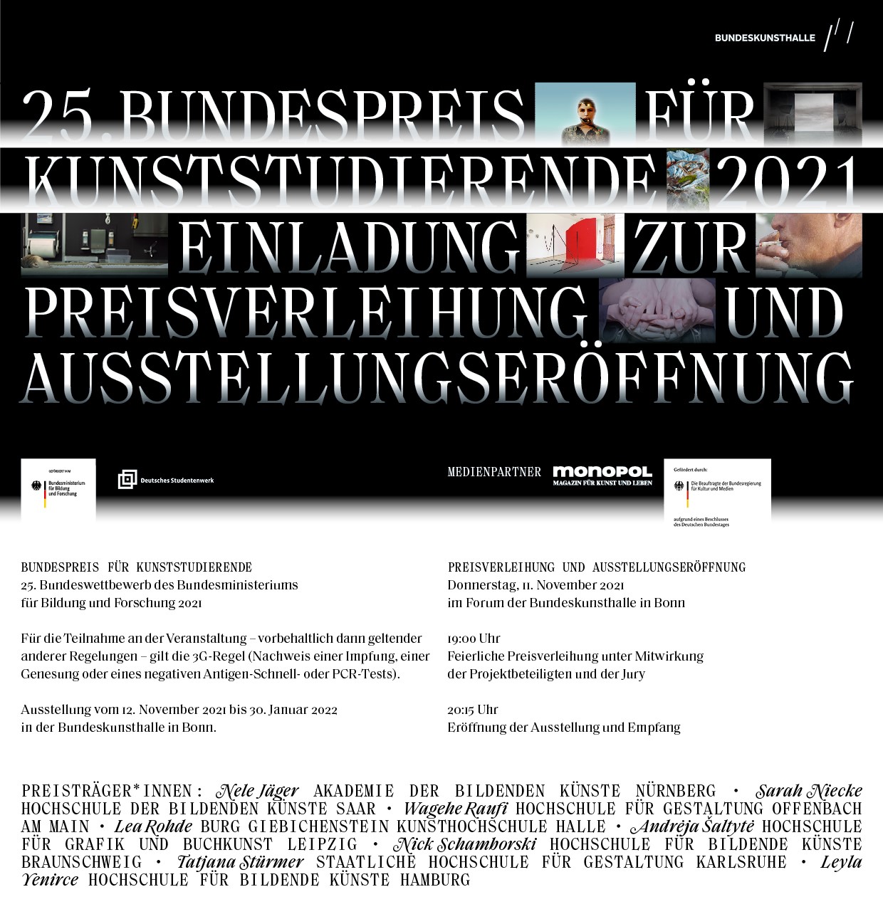 Die Arbeiten der Preisträger*innen werden vom 12. November 2021 bis 30. Januar 2022 in der Bundeskunsthalle in Bonn zu sehen sein.