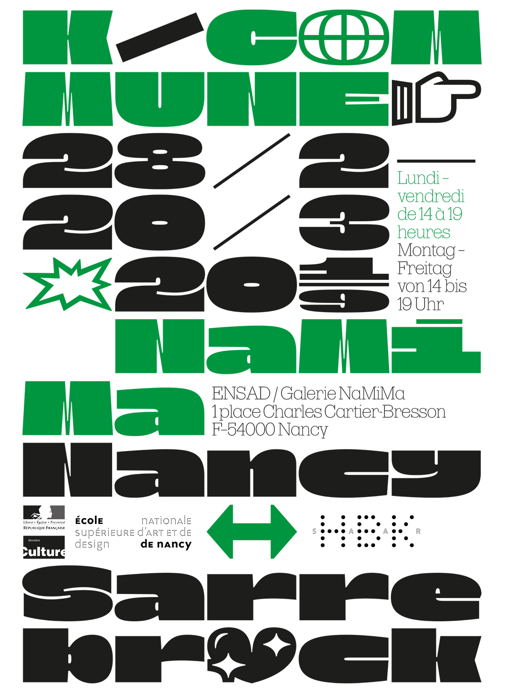 Die Ausstellung „Kommune/Commune“ in der Galerie NaMiMa wird von den Studierenden der ENSAD betreut, die bei der Anschlusspräsentation in Saarbrücken zu Gast sein werden. Im Gegenzug betreuen die Studierenden der HBKsaar, die in Nancy ausstellen, das Projekt „Commune/Kommune“ für die ENSAD-Studierenden in der Galerie der HBKsaar.
