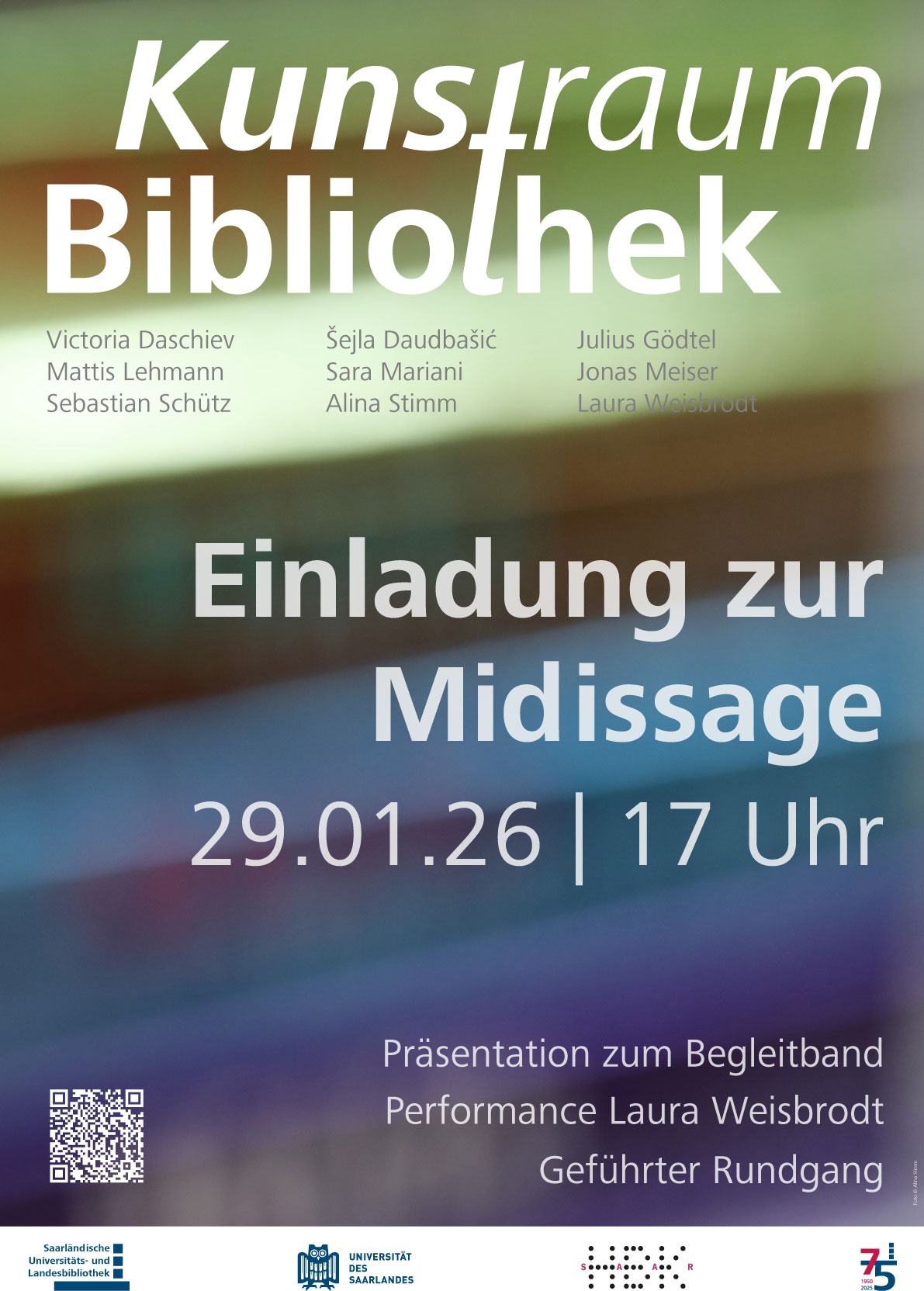 Die Saarländische Universitäts- und Landesbibliothek (SULB) feiert am Donnerstag, 29. Januar, um 17 Uhr mit einer Midissage die Halbzeit der Ausstellung „Kunstraum Bibliothek“. Die Ausstellung ist ein Kooperationsprojekt mit der Hochschule der Bildenden Künste Saar (HBKsaar). Neben der Präsentation des Begleitbandes und einer Lese-Performance wird es unter anderem einen geführten Rundgang durch die Ausstellung geben. Alle Interessierten sind herzlich eingeladen.