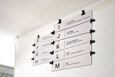 Anfangsbuchstaben teilen. So entstanden teils stark abstrahierte Buchstabenformen, die auf hohen Holzplatten im Raum präsentiert wurden. Um das Erlebnis zu vertiefen, habe
