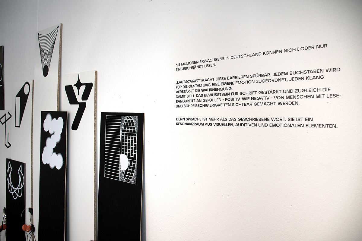 Mir war es wichtig, die Besucher*innen emotional einzubeziehen. Dafür habe ich ein Alphabet entworfen, das die Frustration und Verwirrung spürbar macht, die viele Menschen mit Leseschwierigkeiten täglich erleben.