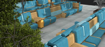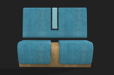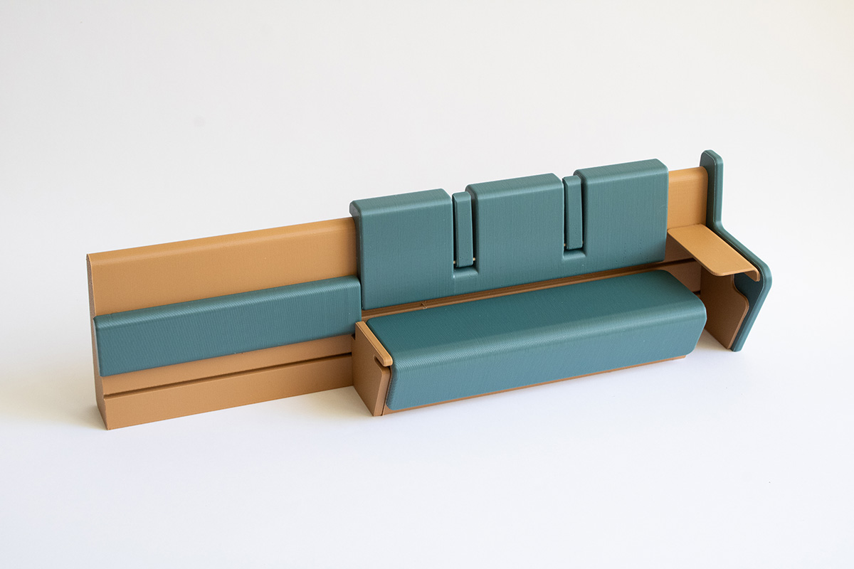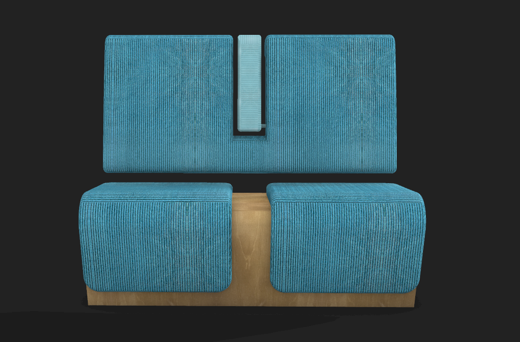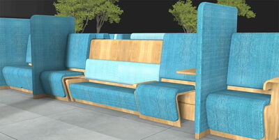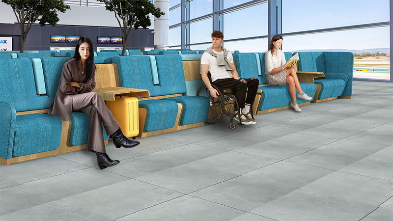 Die Sitzbank bietet drei verschiedene Sitzhöhen: eine niedrigere Sitzhöhe für Kinder, eine genormte Sitzhöhe für den Großteil der Nutzer sowie eine erhöhte Sitzhöhe für ältere Menschen oder größere Personen. Rollstuhlfahrer werden aktiv in die Sitzreihe integriert, indem bei Bedarf ein Modul, beispielsweise die Kinderbank, unter die bestehende Sitzbank geschoben werden kann. Der dadurch entstehende Platz erlaubt nicht nur das Sitzen in der Reihe, sondern auch das einfache Transferieren vom Rollstuhl auf die Sitzbank. Für zusätzlichen Komfort sind die Sitze gepolstert und mit klappbaren Armlehnen ausgestattet, die es den Nutzern ermöglichen, sich bei längeren Aufenthalten, etwa bei Flugverspätungen, hinzulegen. Zwischen den Sitzmodulen befinden sich funktionale Tischelemente, die als Ablage für persönliche Gegenstände, wie Laptops oder Speisen, dienen. Einige Module verfügen zudem über Trennwände, die für mehr Privatsphäre sorgen. Gefertigt aus robustem und nachhaltigem Multiplexholz kombiniert das Sitzsystem eine warme und einladende Optik mit hoher Langlebigkeit. Sowohl das verwendete Holz als auch der Polsterstoff erfüllen die strengen Brandschutzvorschriften für den Einsatz in Flughäfen. Die Polster sind farbig gestaltet, um eine freundliche Atmosphäre zu schaffen und den Aufenthalt für die Reisenden angenehmer zu machen.