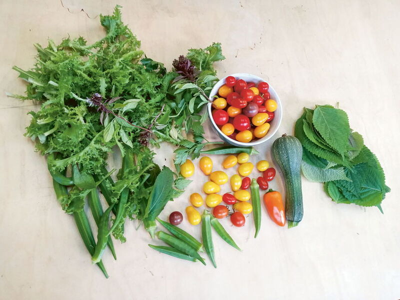 Gartenkräuter: koreanische Petersilie, Minari/ Oenanthe javanica; Basilikum/Ocimum basilicum; Thaibasilikum/Ocimum basilicum var. thyrsiflora; Pfefferminze/Menta piperita; Dill/Anethum graveolens; Fenchel/Foeniculum vulgaris; Majoran/Origanum majorana; Salbei/Salvia officinalis; Schnittlauch/Allium schoenoprasum