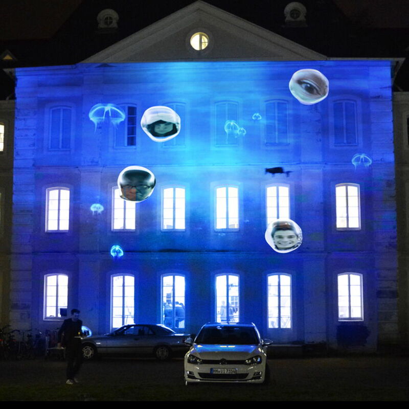 Wir haben die App 'Bubbles' entwickelt, die dir ermöglicht, Teil der Projektion zu sein. Die Betrachter füllen die Unterwassserwelt mit ihren Bildern, die dann mit Meerjungfrauen, Fischen und Quallen umherschwimmen.