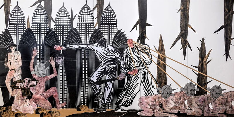 Meine Arbeit bildet diese Verbindung von Vergangenheit und Gegenwart ab. Ich benutze Motive und Symbole aus dem Mittelalter, die unseren immer noch vorhandenen absurden und kindlichen Bezug zur Brutalität spiegeln. Druckgrafik spielt dabei für mich als Mittel der Darstellung eine wichtige Rolle; es ist eine Technik, die sehr kathartisch ist und die intrinsisch mit Gewalt und Leid verbunden ist.