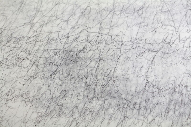 Während des Schreibprozesses entsteht ein automatisierter Schreibfluss, bei dem die Kontrolle über die Sinne mit der Zeit in meine Hand übergeht. Es entstehen lineare Gebilde, von denen einzelne Worte oder Buchstaben nur noch zu erahnen sind. In der Transparenz des Papiers lösen sich die schwarzen Wortstrukturen auf. Nur die oberen, beschriebenen Schichten bleiben sichtbar, während alles andere in der Tiefe verblasst und gleichzeitig den Betrachter festhält. Das Auge merkt, dass es ein Davor und ein Dahinter gibt. Ein irritierendes Sehen, da die einzelnen Schichten verschmelzen, ineinander übergehen. Es bleiben lineare Spuren, die wie gezeichnet wirken können. Beim Blättern der Seiten fangen die Linien an sich zu bewegen. Sie verschwinden und tauchen an anderer Stelle wieder auf.
