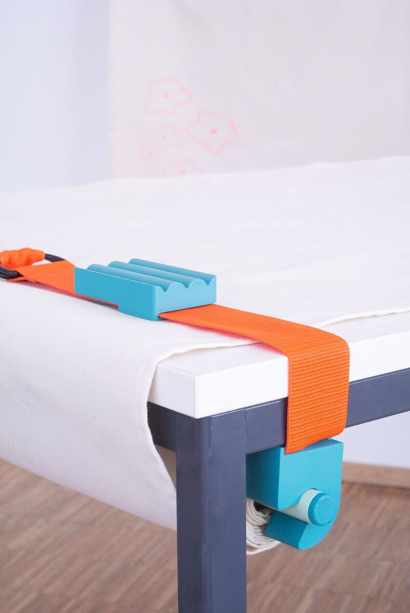 Durch ein Gurtband wird die Gesamtkonstruktion von Befestigungshaken und Textilrolle am Tisch montiert. Klammerartige Verstrebungen machen eine simple Anbringung der Haken am Gurtband möglich. Ebenso kann der Stiftehalter als optionales Add-On hinzugefügt, verschoben und ausgetauscht werden.