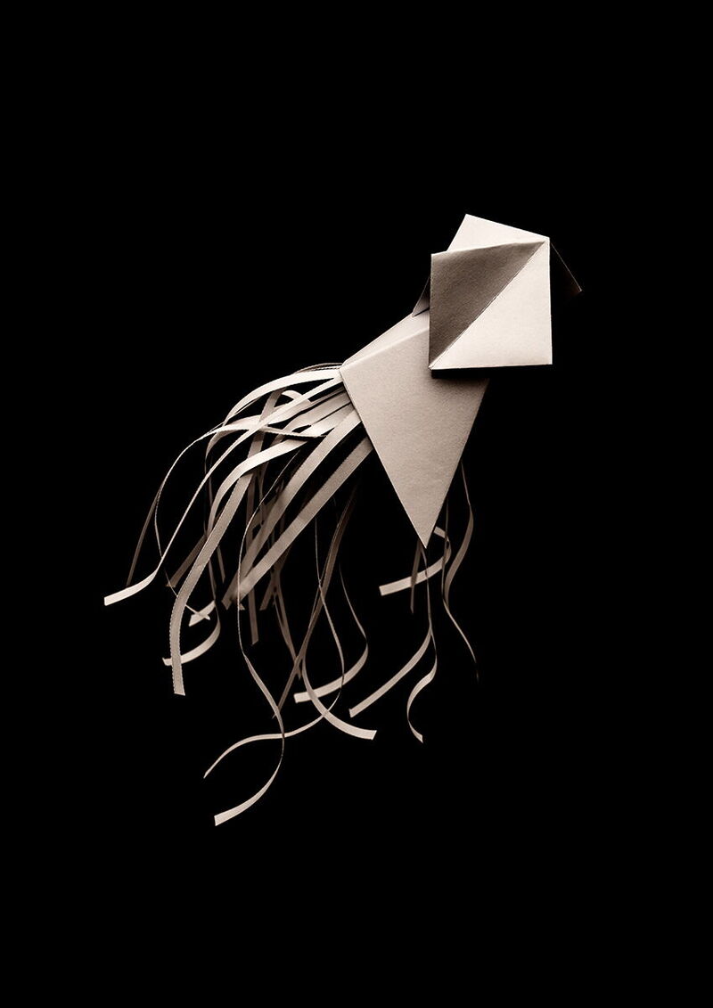 Der erste Ansatz zum Thema »Schwerelosigkeit» war die Darstellung einer humanoiden, im schwarzem Raum schwebenden, Figur. Dazu wurde eine Holzgelenkpuppe mit gefalteten Papier verkleidet und fotografiert. Weitere Papiermodelle wurden ins Wasser getaucht, auf Schnüren im Raum aufgehangen und fotografiert. Die daraus entstandenen Motive erinnern an Meerestiere und -pflanzen, die aber mit ihren geometrischen Formen und ungewohnten Oberflächen eine surreale Anmutung bekommen und an Außerirdische denken lassen.