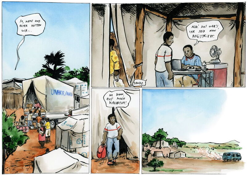 Die erste Geschichte, Die Flucht aus Eritrea, schildert die abenteuerliche Odyssee von Yoanes von Eritrea nach Europa im Jahr 2015. Hierbei setze ich auf dynamische Pinselstriche und Aquarelltechnik in einem realistischen Stil. Durch diesen Stil kann ich den Kontrast zwischen der politischen Misere in Eritrea und der Mitmenschlichkeit sowie die erhabene Schönheit der Natur zeigen.