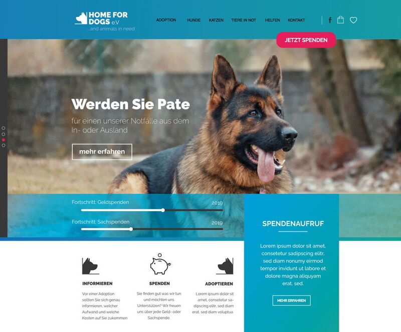 Da dies ein sehr umfangreiches und später auch schwer umzusetzendes Projekt gewesen wäre, bin ich zurück zu meiner ursprünglichen Motivation und zwar Webseiten für Hilfsorganisationen nutzerfreundlicher und schöner zu gestalten. Also habe ich mich entschlossen mir eine lokale Hilfsorganisation zu suchen, mit einer eher veralteten Website. Da viele Organisationen schon jemanden hatten, der sich um Ihre Webseiten kümmert, war es tatsächlich nicht ganz einfach eine zu finden. Nach einiger Zeit kam ich dann durch einen Bekannten auf "Home for Dogs e.V
