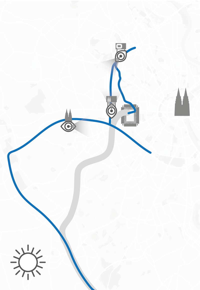 Nach einem ausführlichen Gespräch über Orientierung und Orientierungslosigkeit mit Georg Winter, habe ich mich auf den Weg gemacht, den Kölner Dom zu erreichen, ohne den Weg zu kennen. Als Orientierung dienten mir Schilder, direkter Sichtkontakt zum Dom und der Stand der Sonne.