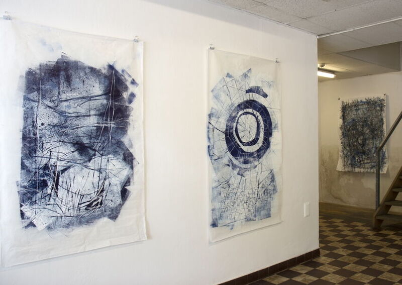 Nach dem Betreten des Ausstellungsraumes befanden sich zur rechten zwei Bleistiftzeichnungen und eine größere Zeichnung aus Kohle und Kreidestaub. Die sich anschließende Wand war mit Holzbohlen verkleidet worden. Hier wurden die beiden Holzdruckstöcke präsentiert. Der Bereich wurde durch die große Säule in der Raummitte vom restlichen Raum abgetrennt.