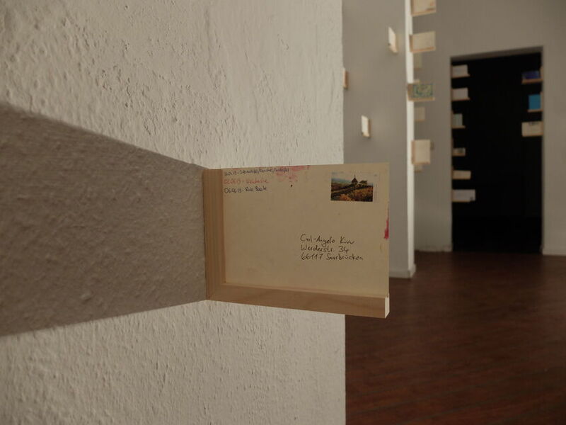 In einem Briefumschlag befinden sich zwei Blätter. Das eine Blatt ist eine von Carl-Angelo Kivu angefertigte Zeichnung. Das zweite ist ein auf der Vorderseite leeres Blatt im Postkartenformat mit seiner Adresse und einer Briefmarke auf der Rückseite.