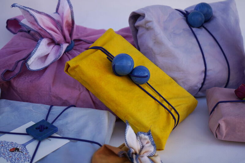 Die Geschenkverpackung Regift besteht aus Reststoffmaterialien aus Omas Generation wie Tischdecken und Bettwäsche, welche mit Naturfarben wie Zwiebelschalen, Beeren und Bohnen eingefärbt sind. Beobachtungen ergaben nämlich, dass diese, meist weißen, hochwertigen Stoffe, mit Bemusterungen wie Blumen oder Punkten oft ungenutzt gelagert wurden.