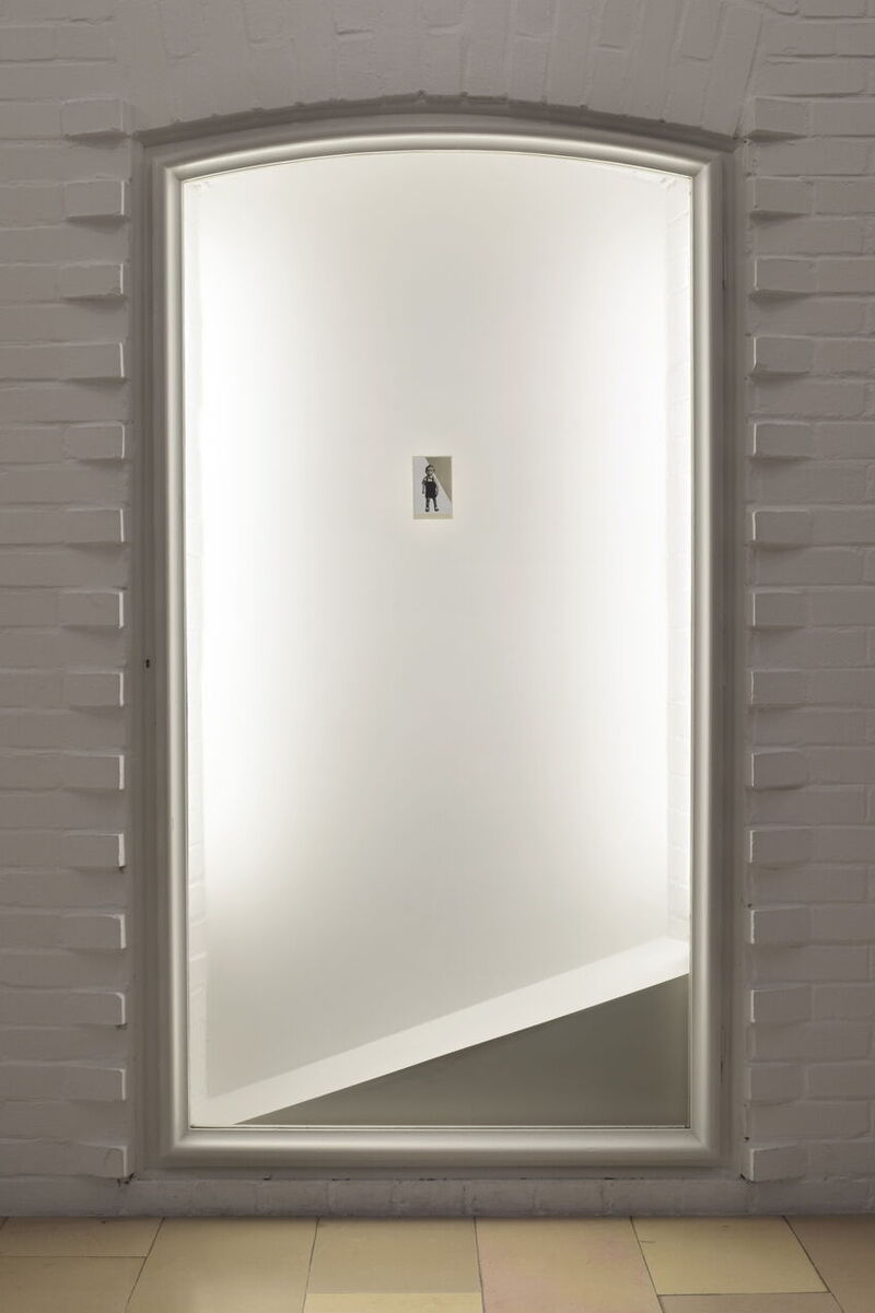 In den drei in die Wand eingelassene Vitrinen scheinen drei Fotografien regelrecht zu schweben. Sie sind an Metallstäben einige Zentimeter vor der Wand angebracht. Die Böden der Vitrinen wurden passend zu den Fotografien bearbeitet: neue Böden wurden eingezogen, zwei davon als schräge Ebenen.