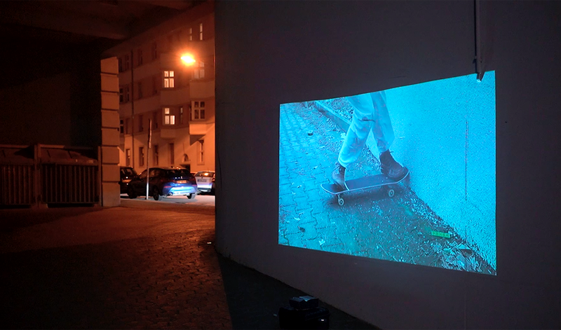 Im nun offensichtlich kulissenhaften Kontext der Stadt oder der leeren Hochschulgalerie eröffneten sich, in den Augen einiger junger Künstler*innen, ganz neue Räume für künstlerische Projektionen, in allen Sinnen des Wortes, während ihre Ateliers an der Hochschule geschlossen blieben und die Begegnungen am Bildschirm allmählich an Attraktivität verloren. In kleinen, experimentierbereiten Gruppen erkunden sie Straßen, Mauern, Räume und Flächen. Mobil ausgestattet mit Bildern, Klängen und Equipment spüren sie im Stadtraum Orte auf, die sich für ihre Eingriffe eignen. Sie bringen künstlerische Handlungen an spezifische Stellen im Stadtgefüge oder in der Ausstellungsstätte und diese gehen mit ihrer gespenstischen Leere in eine ungeahnte Resonanz damit ein. Es entstehen mehrschichtige Situationen: Die gefilmten Aktionen stoßen auf den urbanen, physischen Raum, in Bezug auf den sie auch gedacht werden – passend und unpassend zugleich.