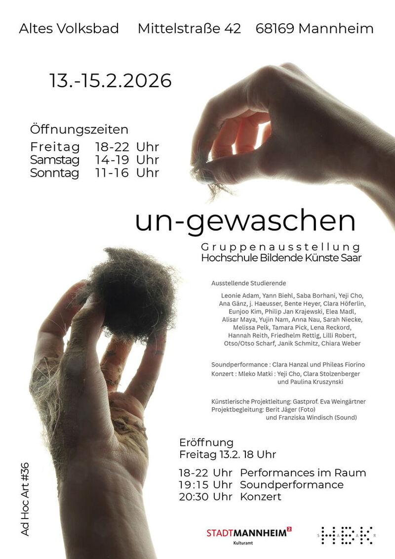 Vom 14. bis 15. Februar 2026 präsentierte die Hochschule der Bildenden Künste Saar (HBKsaar) im Alten Volksbad Mannheim das Projekt „un-gewaschen“. Die Gruppenausstellung Studierender der Freien Kunst verband Installation, Performance, Video, Fotografie und Sound und untersuchte Prozesse des Waschens und Ungewaschenseins als körperliche, soziale und symbolische Zustände.