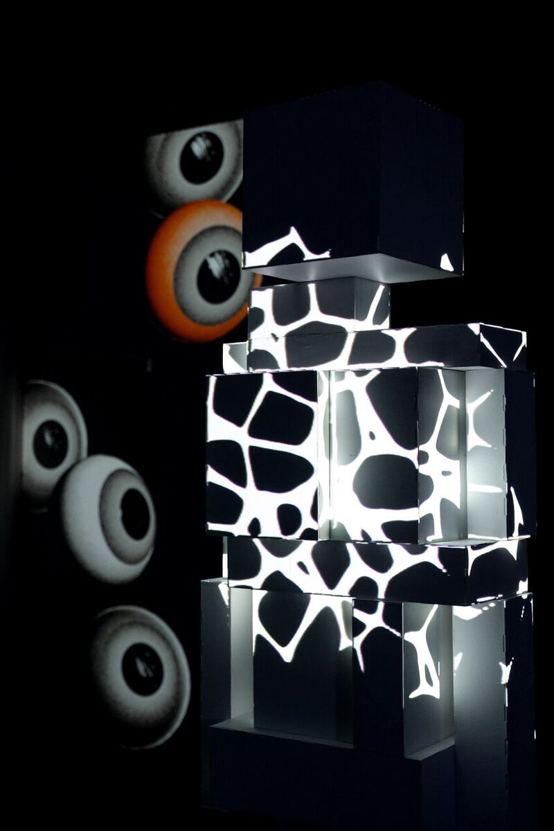 Im Zentrum der Rauminstallation steht eine überlebensgroße, menschenähnliche Holzfigur, die als Leinwand für das Projection Mapping dient. Bei dieser Technik werden die Animationen und visuellen Inhalte passgenau auf die Oberfläche der Figur projiziert. Dadurch entsteht der Effekt, dass die Figur zum Leben erwacht und sich dynamisch verändert, während die abstrakten Animationen sie durchdringen und transformieren. Dabei werden nicht nur die Figur, sondern auch der Boden und der Hintergrund als Projektionsflächen genutzt, um die Figur in ihrem räumlichen Kontext zu zeigen. Die Musik und die abstrakten Animationen verstärken dabei die Wirkung des Gedichts Was für ein Kreis. Durch die Verwendung der Holzfigur als Leinwand für das Projection Mapping wird eine einzigartige und immersive Erfahrung geschaffen, die die Betrachtenden dazu einlädt, sich mit den komplexen Themen von Geschlecht und Schönheit auseinanderzusetzen. Die Figur wird zu einem dynamischen Symbol für die Vielfalt und Veränderlichkeit menschlicher Identität und Schönheit.