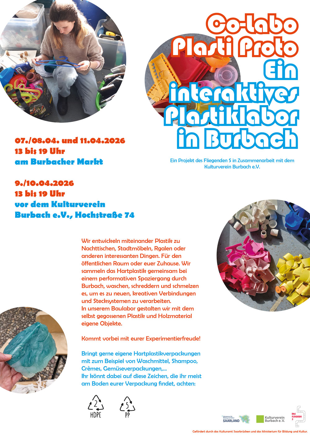 das Fliegende S, ein performatives Stadtforschungs- und social engaged Designkollektiv, lädt herzlich vom 7. bis 11. April 2026 von 13 bis 19 Uhr zu Co-labo Plasti Proto, einem interaktivem Plastiklabor und künstlerischem Community Building Projekt, in Kooperation mit dem Kulturverein Burbach auf dem Burbacher Markt und vor dem Kulturverein ein.